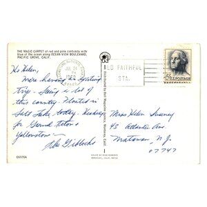 This vintage postcard features the vibrant Magic Carpet of Monterey Bay in Pacific Grove, California. Postmarked July 24, 1968, it showcases a scenic coastal view and historic charm.