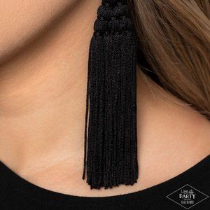 Woven into an intricate frame, shiny black tassels stream from the ear, creating a majestic fringe. Earring attaches to a standard fishhook fitting.