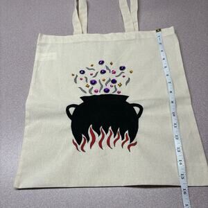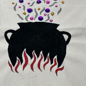 Halloween hand painted cotton tote bag. Hand painted scene of a magic cauldron with rhinestone accents in the background. Please see pictures for measurements and ask any questions.