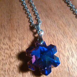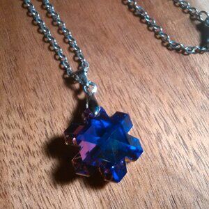 This sparkly pendant necklace features a deep blue-purple color glass snowflake shaped crystal. Many faceted cuts in the piece reflect a lot of light. The pendant is brass set in silvertone, and the chain is stainless steel. The chain is approximately 20 inches in length. Brand new.