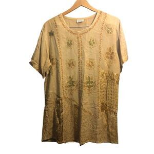 Magic Embroidered Tan Tunic Short Sleeve Round Neck. Rayon Free Size