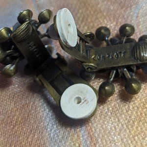 Clip on. Beautiful milky white, yellow, citrine-ish green and pale topazy colored rhinestones. Antique brass look back.