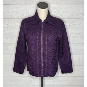 Elevate your style with this Magic It Fits Rhinestone Zipper Jacket! This purple lightweight, quilted jacket is designed to provide a stylish look for cooler weather. The eye-catching rhinestone zipper adds a touch of sparkle and sophistication.