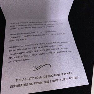 Born and raised in Portland, Oregon, David Wright infuses the artistic spirit of The Great Northwest into his eclectic array of light-weight brooches. The unique chrome-plated sheet steel, cut with a miniature jeweler’s torch, ensures each brooch is a wearable work of art.