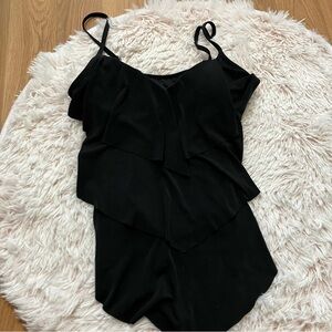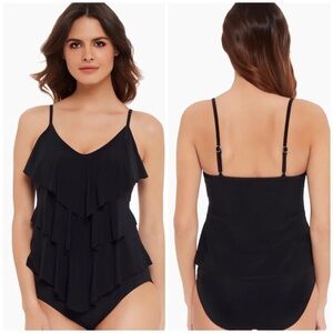 The Magicsuit Rita Tankini is a must-have addition to your summer wardrobe. Its V-neck and triple-tiered ruffles elongate your figure and camouflage the midsection. Adjustable lingerie straps and control back lining provide comfort and support. Made with novelty jersey fabric and LYCRA XTRA LIFE spandex for a long lasting fit.