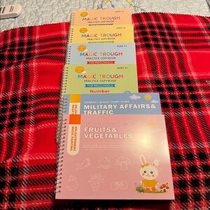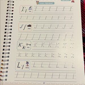 Fun and colorful writing practice set with playful animal designs. Perfect for kids. This is a children's "Magic Trough Writing Practice" set, which includes a reusable notebook for practicing writing.