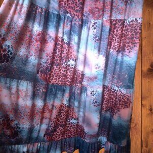 Magic women's plus size 1X maxi skirt is a pull on with elastic waist and belt accent at the front with buckle. It is a tiered ruffle skirt with a gorgeous colorful pattern.