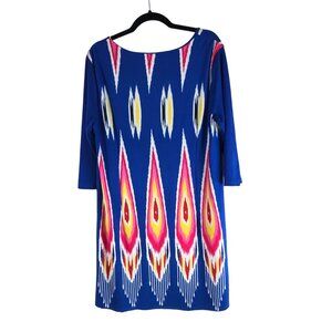 Vibrant blue tunic dress with colorful ikat print. Comfortable fit with 3/4 sleeves, ideal for casual wear.