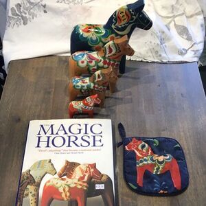 Magic horse set, book pot holder, and four different sized horses from different Olsson artist in times