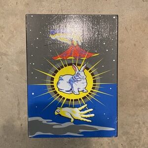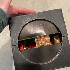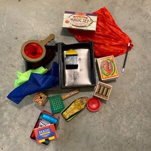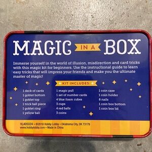 Also includes a small “magic in a box set” with items and instructions to perform 25 tricks. The hinges on the metal storage box are broken but it still closes securely.