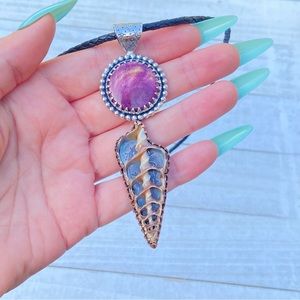 Purple spiny oyster shell and a beautiful spiral shell set in sterling silver, copper detail. Pendant is about 4” long.