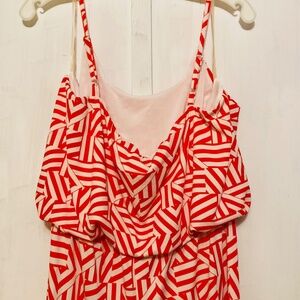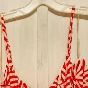 elastic waist, has stretch, chest area fully lined, pull on, no pockets, no zipper, has adjustable straps on spaghetti straps