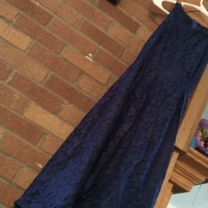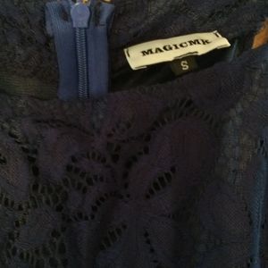 Magic MK Small Dark Blue Stretchy Floral Print High-Low dress with Zipper Closure. EUC Measures 15" Across Waist Length is 39" from shoulder to Hem in front and 57" in back.