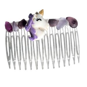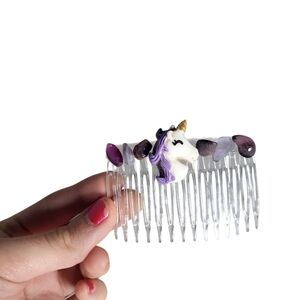 Add a touch of whimsy to your style with this enchanting, handmade hair comb. It features a charming unicorn with a shimmering gold horn and a vibrant purple mane.