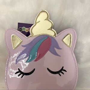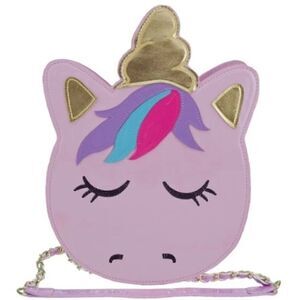 Bring a little magic everywhere you go with our magical unicorn crossbody bag. This faux patent leather mini purse is the perfect size for an afternoon out with friends. It features a sweet unicorn face with a golden horn, a chain shoulder strap and a zipper closure.