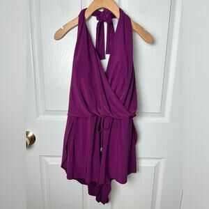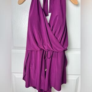 Bianca versatile romper-style swimsuit features built-in elastic bra, soft cups, and elastic waistband with tie front. Adjustable halter tie closure at neck.