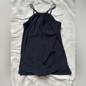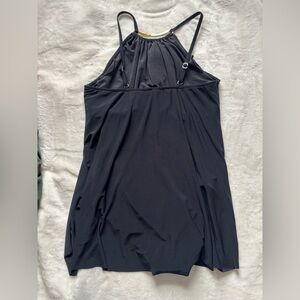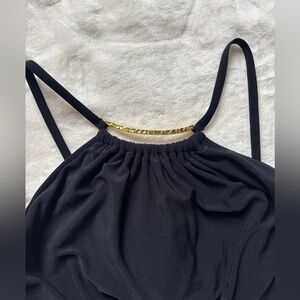 Elegant and flattering black swim dress from Magicsuit. Features a halter neckline with a gold bar detail, adjustable straps, underwire, and molded cups (*missing padding inserts) for support. Includes a full bodysuit underneath for comfort and coverage. The flowy dress overlay adds chic style for poolside lounging or active swim days.