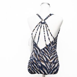Magicsuit – Drew One Piece in Neutral Territory features a flattering V-neckline, fixed straps, and an eye-catching strappy back. The removable soft cup bra offers support and can accommodate up to a D-cup, while the moderate leg cut provides balanced coverage. Crafted from a blend of 68% nylon and 32% LYCRA® spandex for a comfortable, flexible fit.