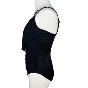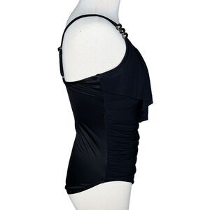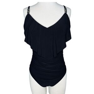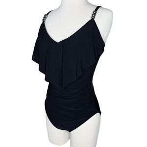 Women's Magicsuit Isabel One Piece Swimsuit, size 10. In good overall condition with minor wear. Solid black with silvertone beading details on front straps. Hidden underwires for support and shaping, with removable padding for modesty. Flattering v-neck shape with straight back. Moderate leg cut. Shirring in bodice for tummy concealment. Provides allover slipping and shaping. Adjustable straps. Style 6006018.