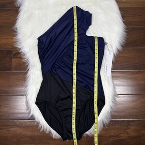 Magicsuit By Miraclesuit Women's Size 8 Navy Blue and Black Colorblock Goddess One Shoulder One Piece Swimsuit, 68% Nylon 32% Spandex, Stretch, Built in Bra Cups with Underwire, Very Light Padding, Style # 6006073
