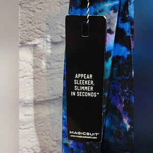 This is a Magicsuit women's one piece swimsuit in a vibrant abstract print of blue, purple, and black tones. It has a high halter neckline with a keyhole detail at the back. The suit features a draped, flowy overlay that provides a flattering and slightly loose silhouette in the front, resembling a tankini style but with the support of a one-piece underneath. The overlay splits in the front, creating an asymmetrical hem that adds a touch of elegance. The bottom part is black, offering a sleek, contrasting look that emphasizes the colorful print on top. This design is ideal for anyone looking for stylish coverage while maintaining a trendy and modern swimsuit appearance.