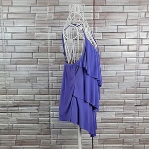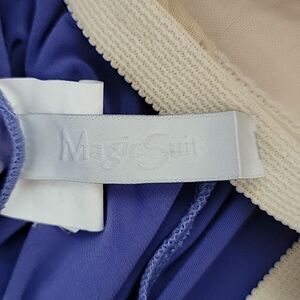 Magicsuit's body control swimwear in a lovely lilac color with angled tiers draping the front, built-in padded cups for comfort, and adjustable straps. Good pre-owned condition. There is some color fading on the inside of this swimsuit.