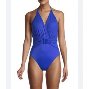 Magicsuit by Miraclesuit Angelina Draped Bathing Suit Blue Plunge One Piece 16