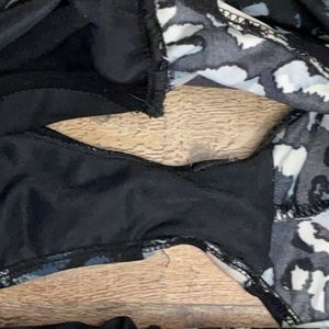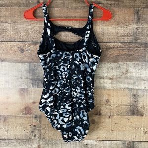 MagicSuit leopard print one piece swimsuit. Size info gone. Measurements posted below. Black and white leopard print. Ruched sides. Cutout at the top. Underwire. Excellent condition, but there is a cut in the lining. See pics. Won't be visible when worn.