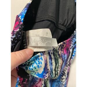 Hello lady! This sassy suit will nip you in and accentuate you assets. Beautiful colorful snake print help camouflage any areas you don’t want to draw attention to. Size 10