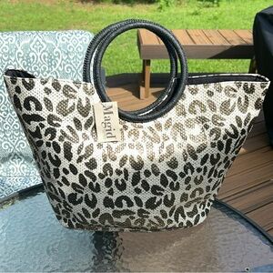 Stylish leopard print tote by Magid. Features sturdy round handles. Perfect for everyday use.