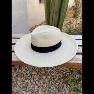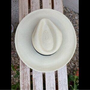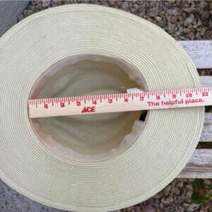 Constructed from a blend of polypropylene, this hat offers a balance of durability and comfort. The lightweight nature of the material keeps you cool, while the supple texture ensures a comfortable fit. Easy to fold and pack, making it a convenient travel companion. Despite its flexibility, it retains its elegant shape, ready to wear whenever you are. Preworn-shows some signs of wear (inside brim). Ideal choice for sunny days and beach outings.