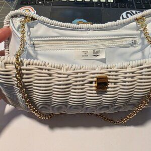 Used, like new condition; Smoke-free house. Magid brand white wicker purse, clutch. Clean condition inside and out. Zippered inside pocket. Approximately 9 1/2" x 6" X 2 1/2" at its widest. Chain is approximately 42" long.