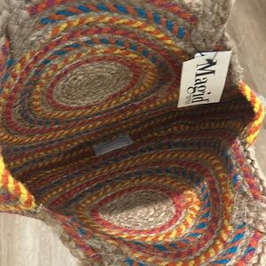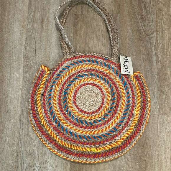 Magid womans circle woven jute oversized beach tote bag. Approximate measurements laying flat 16” x 18”.