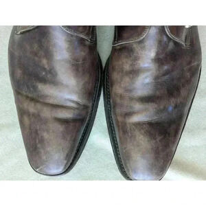 Bottom soles are very worn. There are soft spots (see pictures). Bottom soles may need to be replaced sooner than later. Upper leather are still good with normal scratches & scuff marks (see pictures).