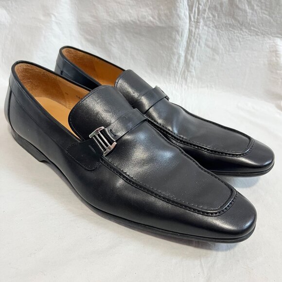 Magnanni Lino loafers, black leather, strap, silver tone hardware, slip on, rubber soles, US men's size 15, preowned and shows wear on the soles, creasing, scuffs - see photos