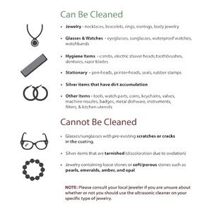 - Uses ultrasonic waves to deep clean jewelry, watches, glasses, and other small items without harsh chemicals or scrubbing.