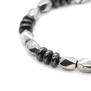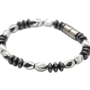 This handcrafted bracelet features a sleek silver and black palette that combines modern elegance with effortless wearability. The design uses 7mm x 9mm dark silver-plated twisted tube beads paired with 8mm flat round hematite crystals, creating a beautiful contrast of shine and texture. Each bead reflects light subtly, giving the bracelet a refined shimmer without being overly flashy. The cool metallic tones make it an ideal accessory for both men and women, and it pairs easily with casual outfits or formal attire. The bracelet closes with two powerful 8mm round magnetic tube clasps, ensuring a secure fit while making it simple to put on and take off—no struggling with tiny hooks or clasps.