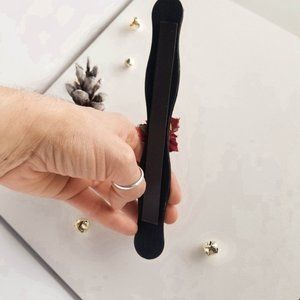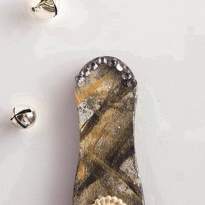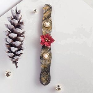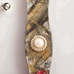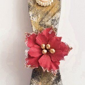 Decorate your office or your fridge with this beautiful and creative Swirly wooden stick transformed into a magnet. It is hand-painted with black, white and gold color and decorated with rhinestones and pearl buttons, with a red/gold poinsettia with frosted ice centerpiece.