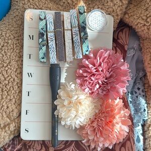 has been used, still good condition, 6 paper clips, good working marker, mirror that is a little scratch, three magnetic flowers, shelf that is meant for lockers