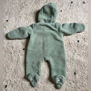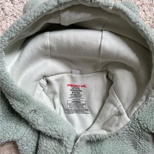 Adorable bear-themed footie with cozy hood and ears. Soft fabric for ultimate comfort. Features cute paw print detail. Keeps your baby warm and cozy in chilly weather with a magnetic easy on/off feature.