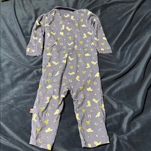 Charming blue one piece with fun designs. Soft fabric for comfort.