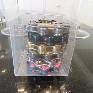 Fun conversation pieces crafted from different colored bicycle chains. Made using very strong magnets to pull and hold the ends of the chains together.