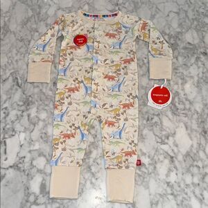 Charming one piece with vibrant dinosaur pattern. Easy magnetic closure. Soft and cozy for comfort.