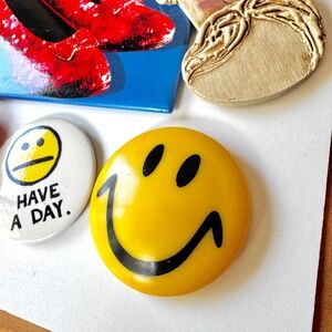 One price gets you all the items shown! There are 9 magnets and 1 souvenir keychain. The items are vintage from the '70s to 90s. The condition of the older items shows more wear; please zoom in on photos to examine. There are 4 smile themes, one Kewpie dolls, one Revereware, one Gunsmoke, one Santa Claus, and one ruby slippers. The Texas tiki keychain is made of lightweight wood and is also a whistle.