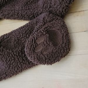 This brown fleece bunting is listed as 6-9 mos but runs EXTREMELY small. It's more like a 3 month size, and VERY slim, so would work best for a skinny babe. Hood feels a bit small as well.