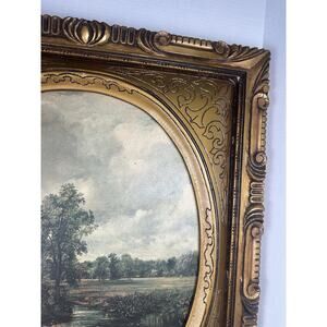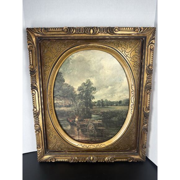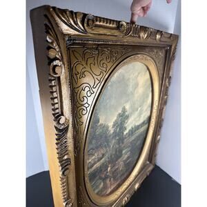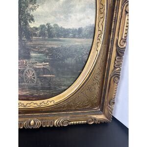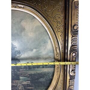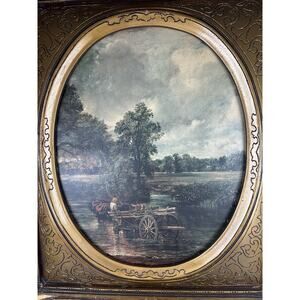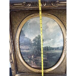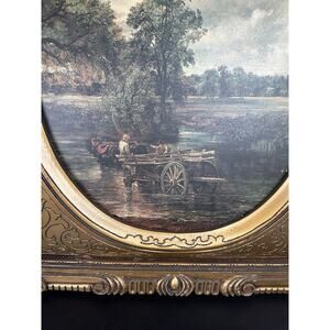 Antique oil painting titled "Hubert, Harvest Scene with Mill, 1870". The painting features a rustic landscape with a mill and a horse-drawn cart in a stream. It is an oval oil on canvas painting in its original ornate gilt wood frame from the 19th century.