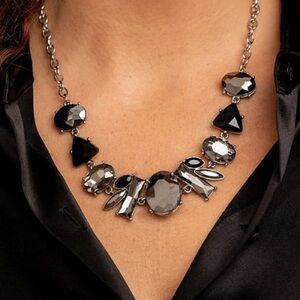 Anchored by a glassy oval hematite gem, a mismatched collection of lustrous hematite, smoky, and black rhinestones in various modern shapes and sizes link together across the collar. The gritty display gives way to a classic silver chain for a sleek finish. Features an adjustable clasp closure.
