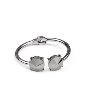 Bracelet: Two dramatically oversized hematite rhinestones are nestled inside pronged gunmetal fittings at the ends of a hinged gunmetal cuff, creating a smoldering statement piece that wraps boldly around the wrist. Features a hinged closure.