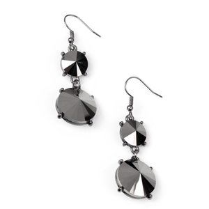 Earrings: Featuring pronged gunmetal fittings, two oversized hematite rhinestones dramatically link into a bold smoldering lure as they drip dazzlingly from the ear. Earring attaches to a standard fishhook fitting.