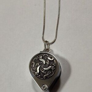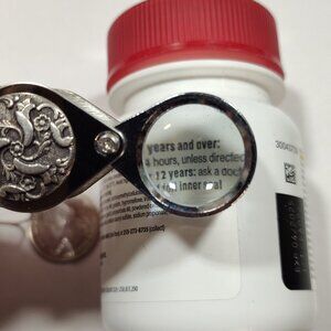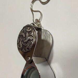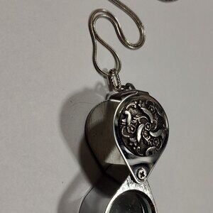 Magnifying Glass Oxidized Silver Floral Ornate Loupe Pendant Necklace 20x comes with a 30" 1mm sterling silver plated snake style chain for easy use. Item is unisex. Professional quality. Loupe comes in a round chrome plated swing-away case. Handy and easy to use. It is 20x strong and has a focal distance of 1/2" (13mm). The lens measures 21mm in diameter. Please take your time and view all photos carefully and please ask questions prior to purchasing. Because something that appears insignificant to me may be significant to you. Would make a great gift or you can make it yours today. Gift wrapping is provided free of charge. Please indicate that this is a gift when checking out. And again, any questions, please contact me, thank you for stopping by.